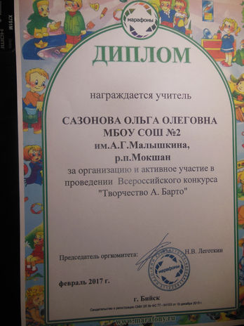 -Диплом за организацию и активное участие в проведении Всероссийского конкурса «Творчество М.Ю.Лермонтова», «Творчество А.Барто».