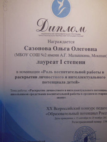 - Диплом лауреата 1 степени 20 Всероссийского конкурса педагогов «Образовательный потенциал России» в номинации «Роль воспитательной работы в раскрытии личностного и интеллектуального потенциала детей» (№ 1593587)