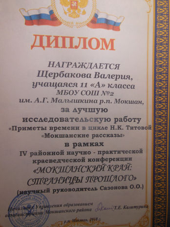 4 районная научно-практическая краеведческая конференция «Мокшанский край: страницы прошлого». Призёры- Щербакова Валерия, Ягодина Екатерина. Щербакова Валерия-лучшая работа.