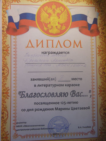 Безбородов Алексей и Дрожжин Александр- 2 место в муниципальном литературном караоке, посвящённом 125-летию со дня рождения М.И.Цветаевой